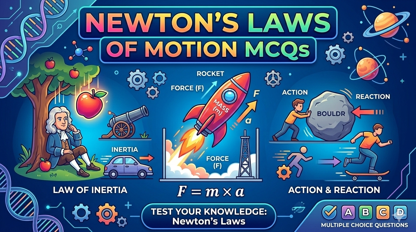 Test your understanding of Newton’s three laws of motion with 10 MCQs covering force, inertia, momentum, and action-reaction pairs. Perfect for board exam and entry test preparation.